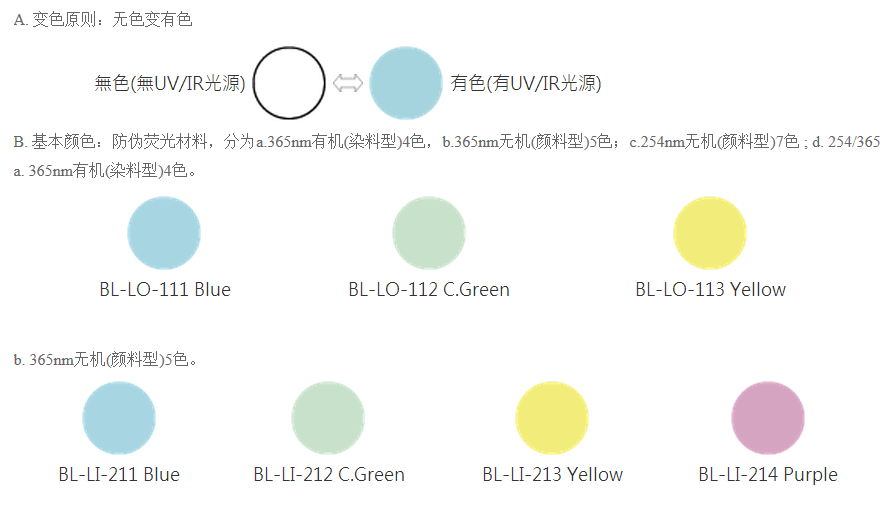 本系列產品特殊熒光體在可見光光源下,呈現白色或接近透明色,在不同波長光源下(254nm、 365 nm、 850 nm) 顯現一種或多種熒光色澤,包括有機、 無機、余暉等特殊效果,色彩鮮艷亮麗,熒光標識材料主要用于生產防偽油墨和標志塑料。